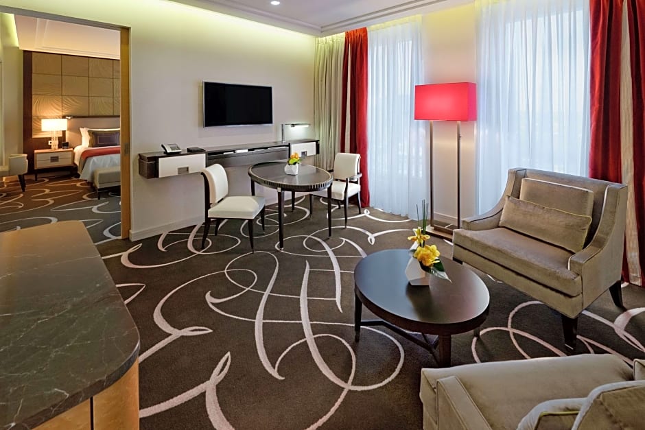 Experience contemporary elegance in this 63sq m/678sq ft. King Corner Suite, corner location, marble bathroom with built-in TV, WiFi, two 40-inch TVs